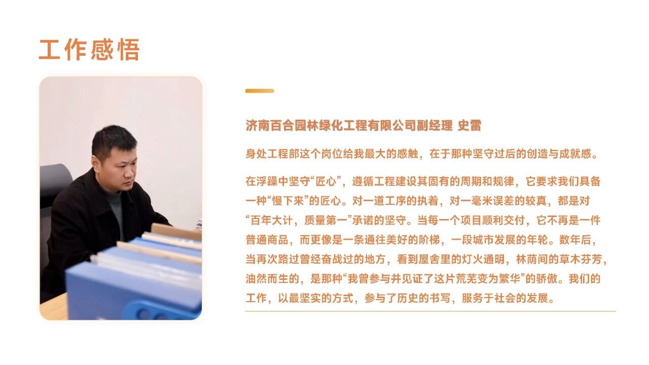 匠心足迹 强调园林人的专业精神和一步一个脚印的奋斗历程。“百合视界“指通过员工的视角(感悟和随手拍)展现的公司风貌。突出专业性和员工视角。