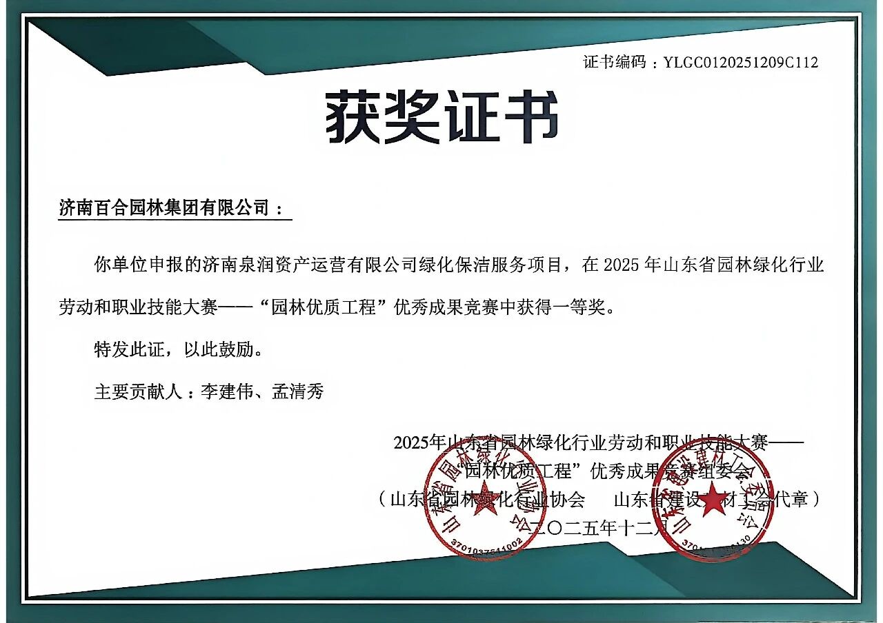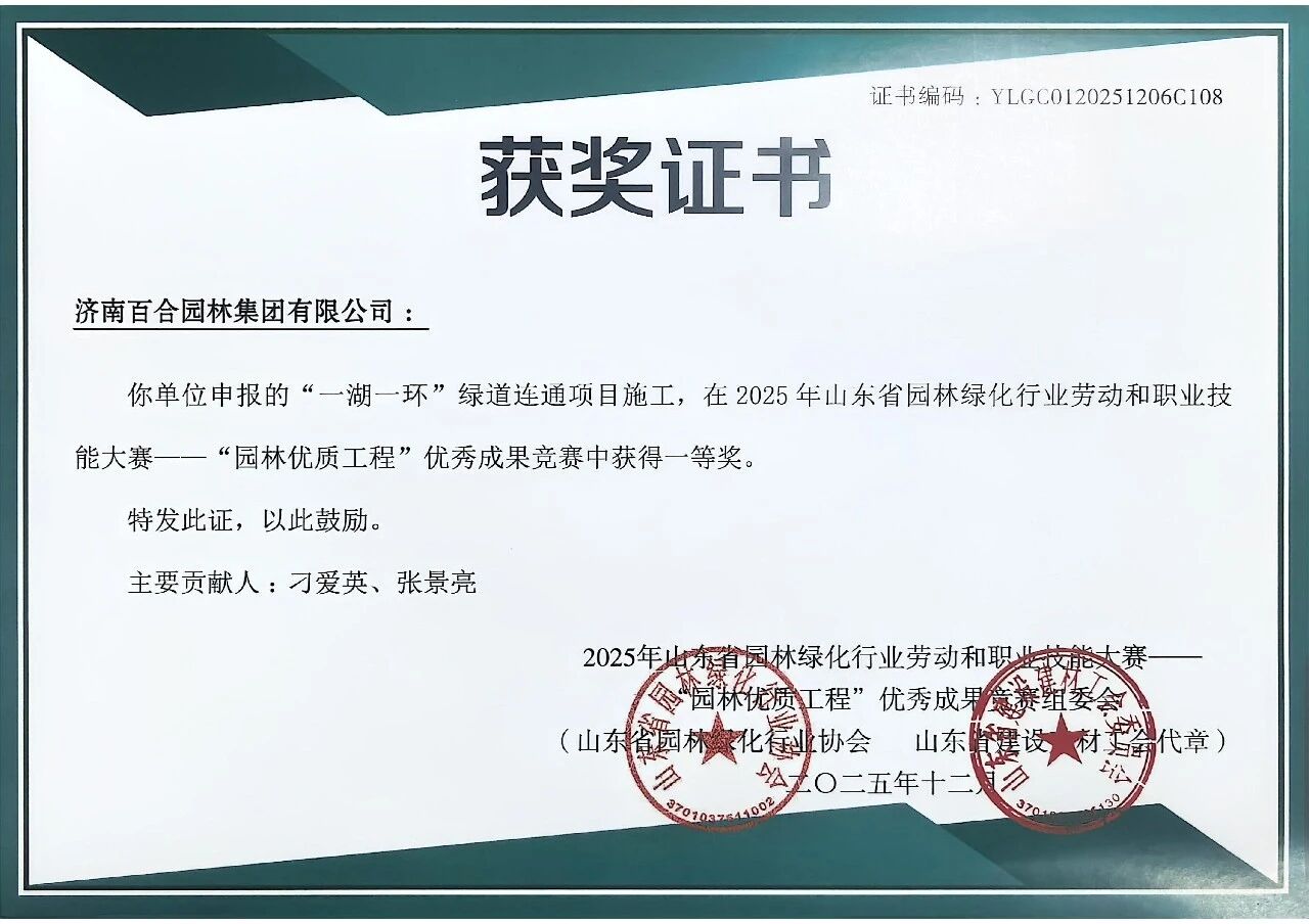 近日,2025年山东省园林绿化行业劳动和职业技能大赛——“园林优质工程”优秀成果竞赛活动结果揭晓。济南百合园林集团有限公司凭借卓越的综合实力与精湛的专业技艺荣获多项荣誉。